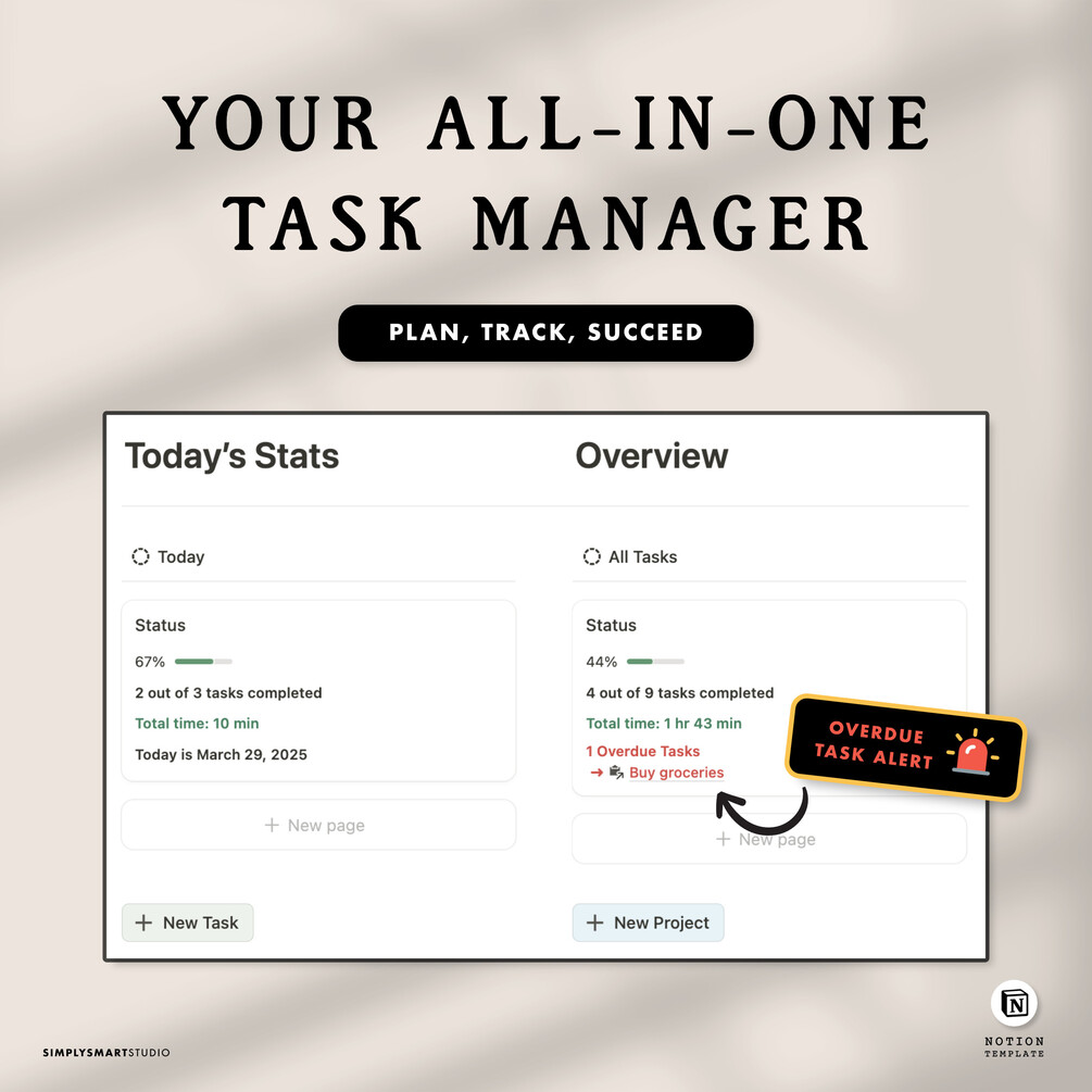 Tired of juggling tasks, losing track of time, and missing deadlines? Meet your new productivity powerhouse: a Notion Task Manager Template built to streamline your day, track your progress, and keep your projects on point—all in one place.