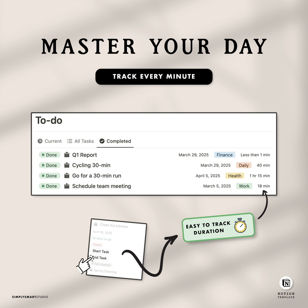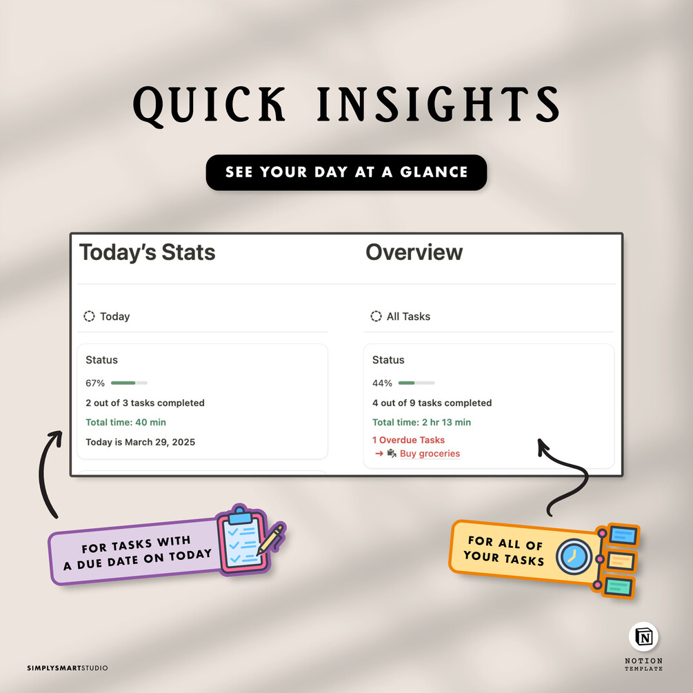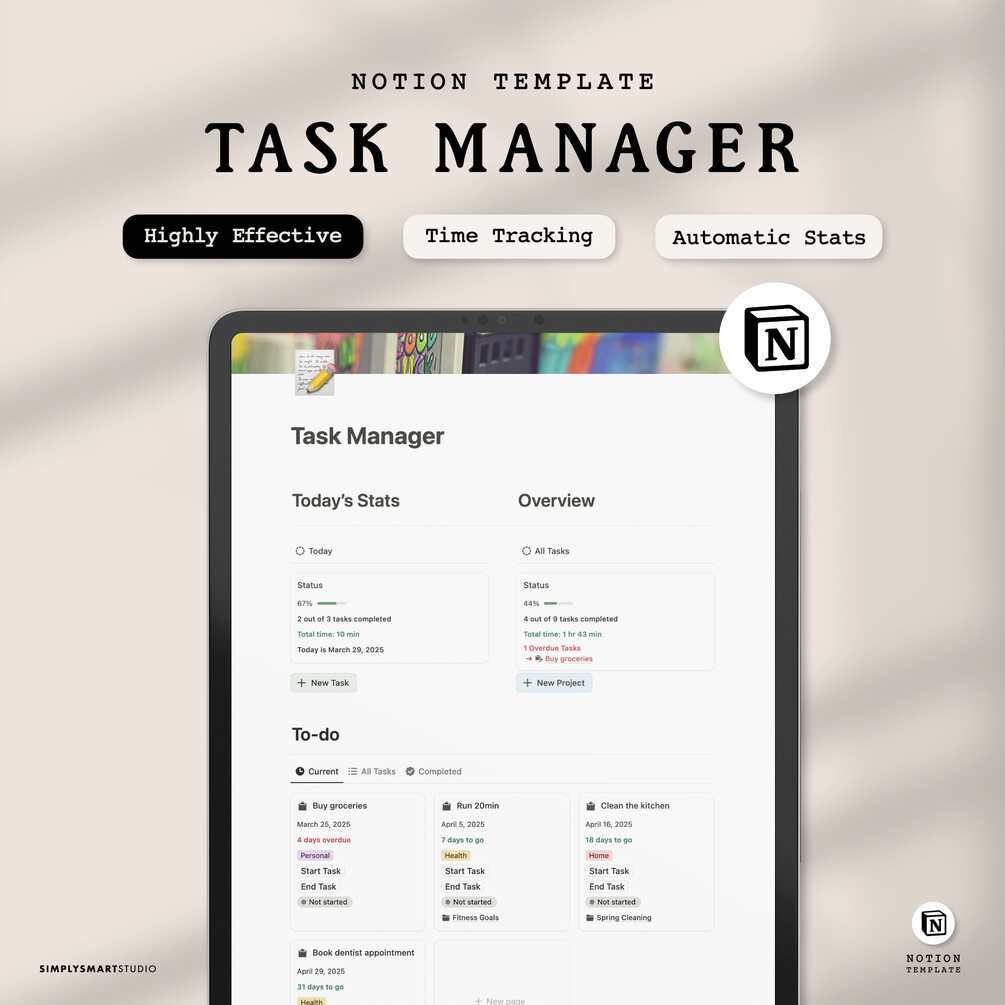 Notion Task Manager Template with Time Tracker, Projects, To-Do List & Daily Stats