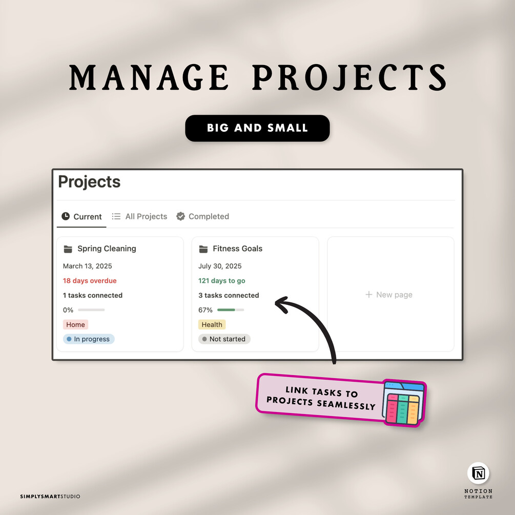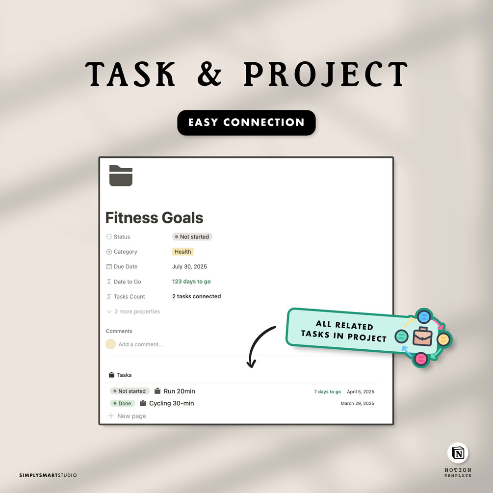 ✓ Project Power, Link tasks to projects or vice versa. Track total tasks, completion rates, and time spent with built-in rollups and progress bars.
